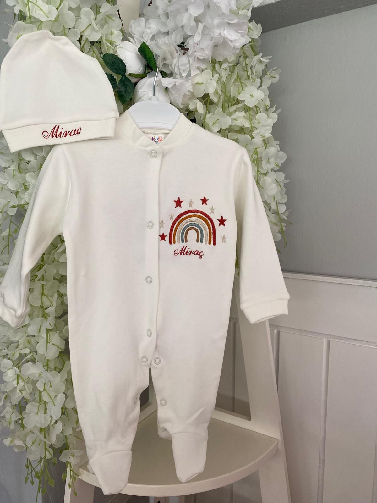 Bohem Gökkuşağı Nakışlı İsimli Yenidoğan Tulum Takımı