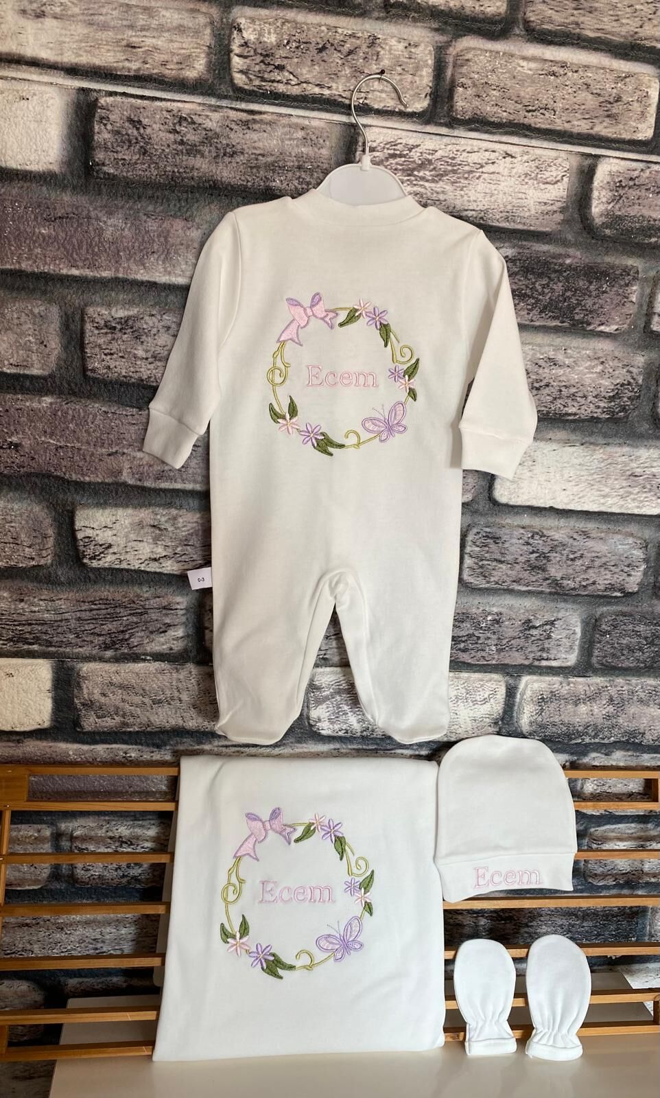 Çiçek Nakışlı İsimli Yenidoğan Tulum Takımı - Hastane Çıkış Seti